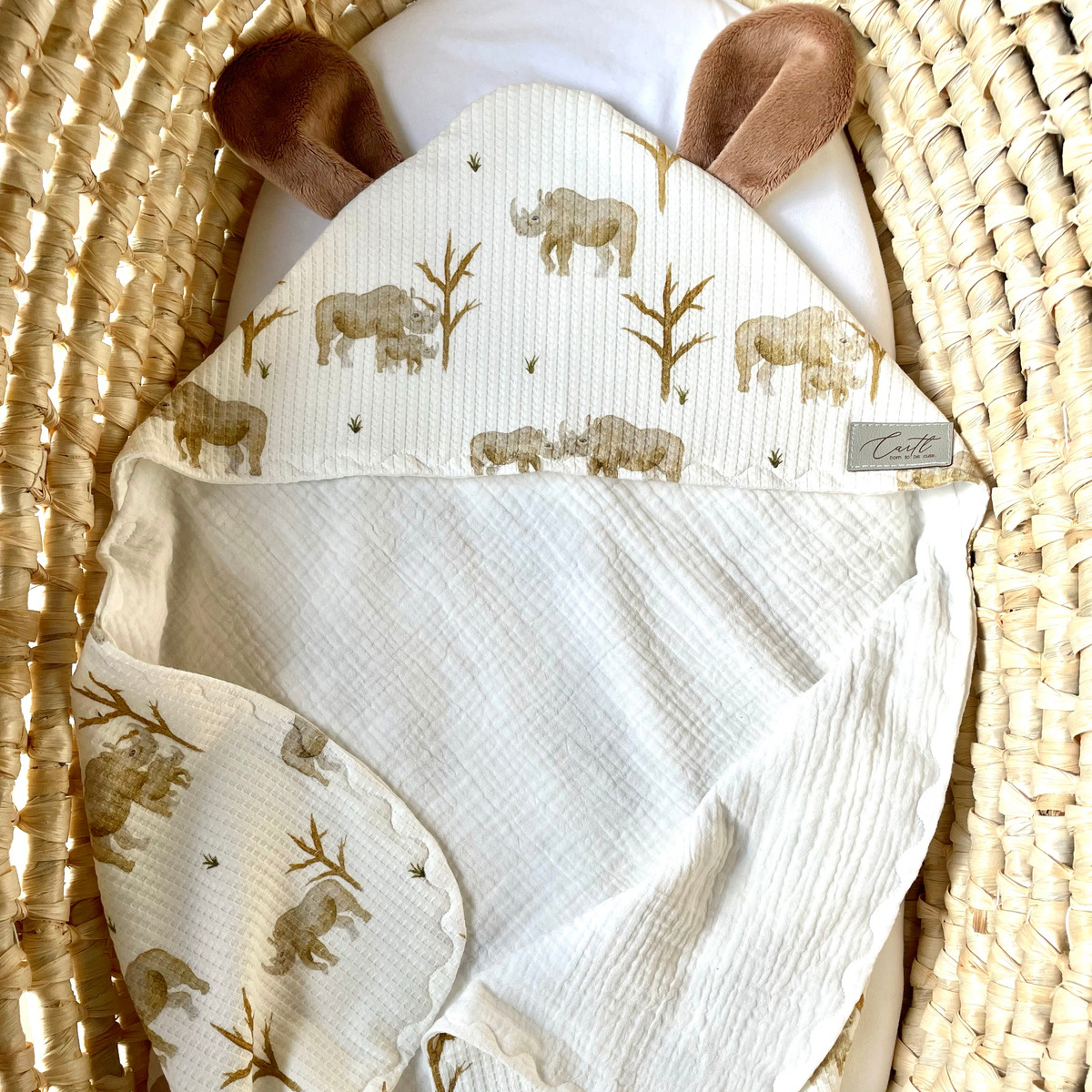 Ušeska so iz prijetnega, mehkega pliša, sama brisačka pa se svojo nevtralno barvo poda v vsako kopalnico ali pa otroško sobo.